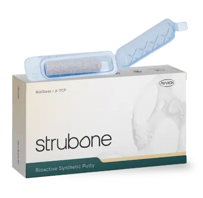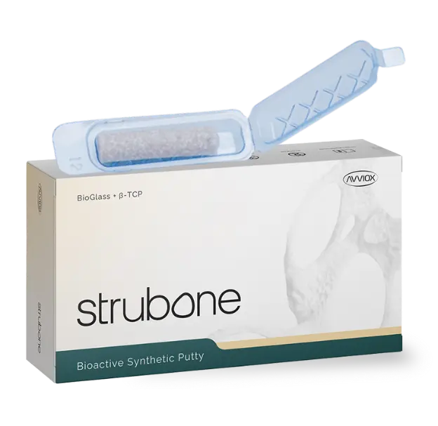 Strubone® es Biomaterial compuesto por: Vidrio bioactivo 45S5 + βeta Fosfato Tricálcico en Putty o masilla, sintético y bioactivo. Antimicrobiano, osteoconductivo, capaz de integrarse óptimamente durante el proceso de consolidación.
