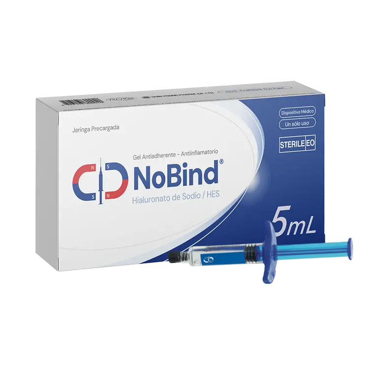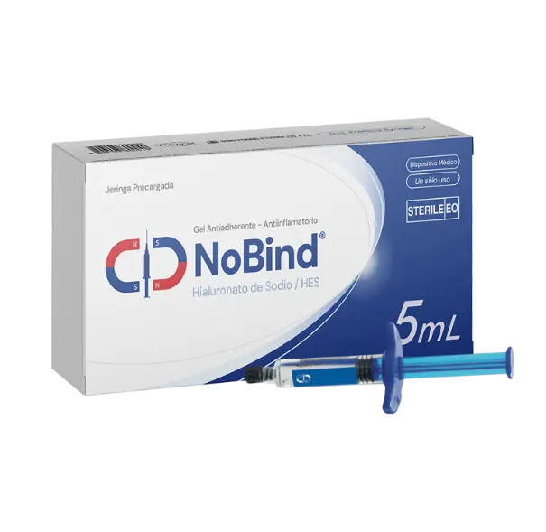 Nobind combina Hialuronato de Sodio + Hidroxietilamilopolímero (HA-HES) para crear un gel de alta viscosidad que permanece donde lo aplicas, reduce la inflamación y evita que los tejidos formen puentes fibróticos que deriven en adherencias postoperatorias.